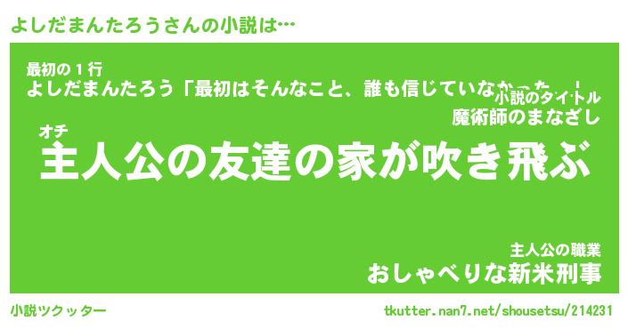 よしだまんたろうさんの小説は… オチ『主人公の友達の家が吹き飛ぶ』最初の1行『よしだまんたろう「最初はそんなこと、誰も信じていなかった。」』主人公の職業『おしゃべりな新米刑事』 ツクッター #小説ツクッター http://tkutter.nan7.net/shousetsu/214231/