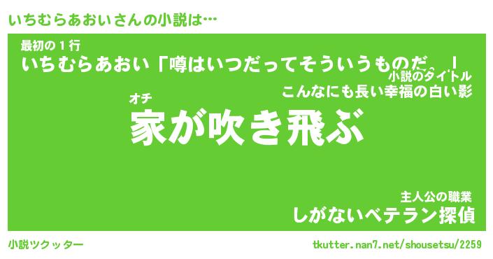 いちむらあおいさんの小説は… オチ『家が吹き飛ぶ』最初の1行『いちむらあおい「噂はいつだってそういうものだ。」』主人公の職業『しがないベテラン探偵』 ツクッター #小説ツクッター http://tkutter.nan7.net/shousetsu/2259/