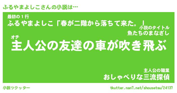 ふるやまよしこさんの小説は… オチ『主人公の友達の車が吹き飛ぶ』最初の1行『ふるやまよしこ「春が二階から落ちて来た。」』主人公の職業『おしゃべりな三流探偵』 ツクッター #小説ツクッター http://tkutter.nan7.net/shousetsu/24137/