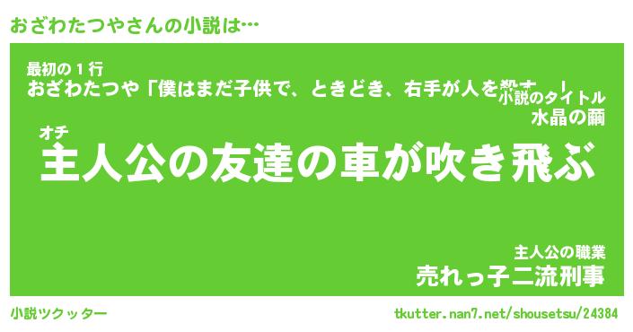 おざわたつやさんの小説は… オチ『主人公の友達の車が吹き飛ぶ』最初の1行『おざわたつや「僕はまだ子供で、ときどき、右手が人を殺す。」』主人公の職業『売れっ子二流刑事』 ツクッター #小説ツクッター http://tkutter.nan7.net/shousetsu/24384/