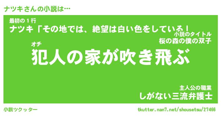 ナツキさんの小説は… オチ『犯人の家が吹き飛ぶ』最初の1行『ナツキ「その地では、絶望は白い色をしている」』主人公の職業『しがない三流弁護士』 ツクッター #小説ツクッター http://tkutter.nan7.net/shousetsu/27466/