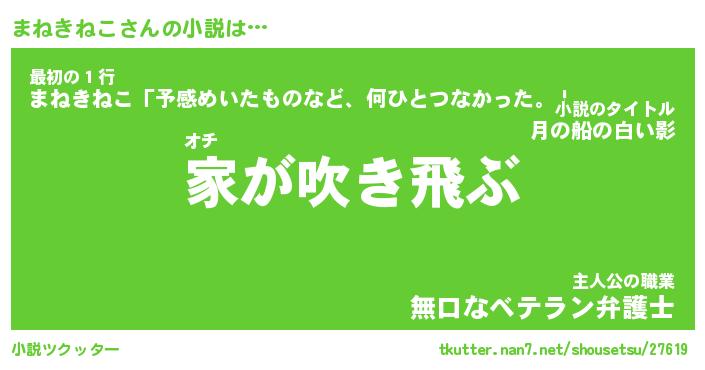 まねきねこさんの小説は… オチ『家が吹き飛ぶ』最初の1行『まねきねこ「予感めいたものなど、何ひとつなかった。」』主人公の職業『無口なベテラン弁護士』 ツクッター #小説ツクッター http://tkutter.nan7.net/shousetsu/27619/