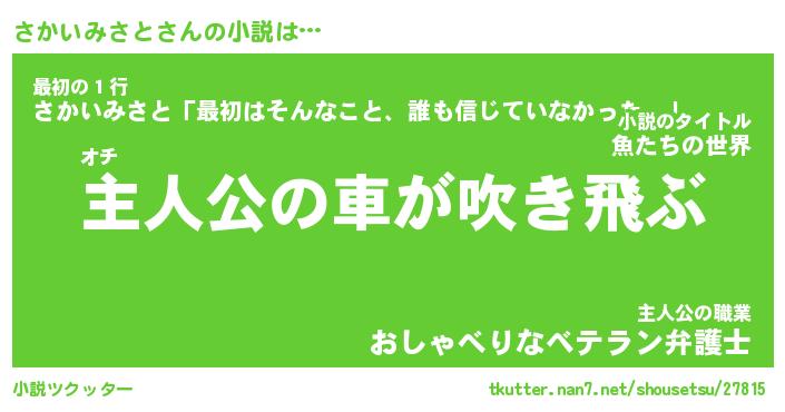 さかいみさとさんの小説は… オチ『主人公の車が吹き飛ぶ』最初の1行『さかいみさと「最初はそんなこと、誰も信じていなかった。」』主人公の職業『おしゃべりなベテラン弁護士』 ツクッター #小説ツクッター http://tkutter.nan7.net/shousetsu/27815/
