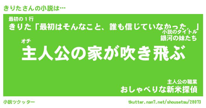 きりたさんの小説は… オチ『主人公の家が吹き飛ぶ』最初の1行『きりた「最初はそんなこと、誰も信じていなかった。」』主人公の職業『おしゃべりな新米探偵』 ツクッター #小説ツクッター http://tkutter.nan7.net/shousetsu/28073/