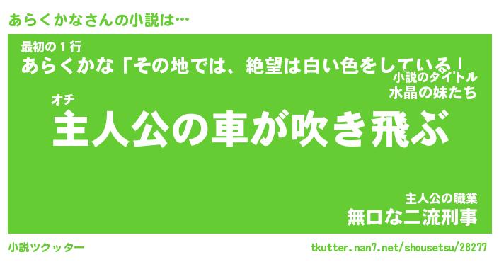 あらくかなさんの小説は… オチ『主人公の車が吹き飛ぶ』最初の1行『あらくかな「その地では、絶望は白い色をしている」』主人公の職業『無口な二流刑事』 ツクッター #小説ツクッター http://tkutter.nan7.net/shousetsu/28277/