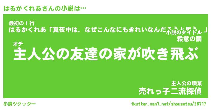はるかくれあさんの小説は… オチ『主人公の友達の家が吹き飛ぶ』最初の1行『はるかくれあ「真夜中は、なぜこんなにもきれいなんだろうと思う。」』主人公の職業『売れっ子二流探偵』 ツクッター #小説ツクッター http://tkutter.nan7.net/shousetsu/28717/