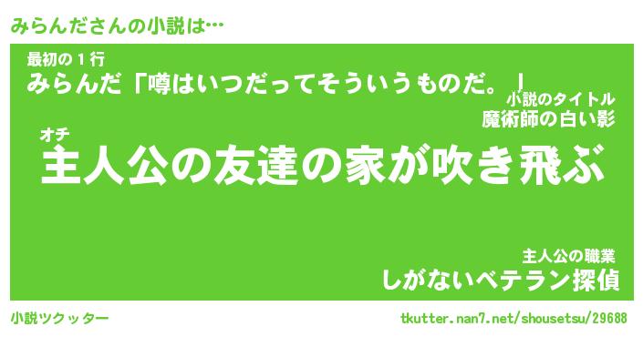 みらんださんの小説は… オチ『主人公の友達の家が吹き飛ぶ』最初の1行『みらんだ「噂はいつだってそういうものだ。」』主人公の職業『しがないベテラン探偵』 ツクッター #小説ツクッター http://tkutter.nan7.net/shousetsu/29688/