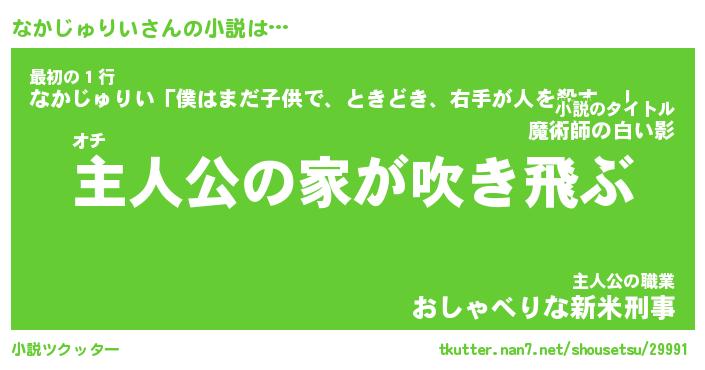 なかじゅりいさんの小説は… オチ『主人公の家が吹き飛ぶ』最初の1行『なかじゅりい「僕はまだ子供で、ときどき、右手が人を殺す。」』主人公の職業『おしゃべりな新米刑事』 ツクッター #小説ツクッター http://tkutter.nan7.net/shousetsu/29991/