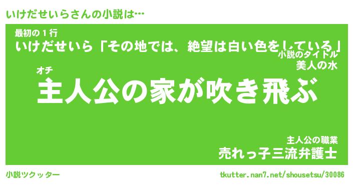 いけだせいらさんの小説は… オチ『主人公の家が吹き飛ぶ』最初の1行『いけだせいら「その地では、絶望は白い色をしている」』主人公の職業『売れっ子三流弁護士』 ツクッター #小説ツクッター http://tkutter.nan7.net/shousetsu/30086/