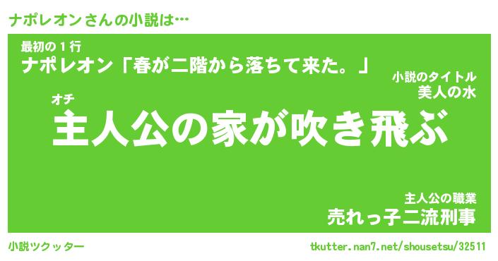 ナポレオンさんの小説は… オチ『主人公の家が吹き飛ぶ』最初の1行『ナポレオン「春が二階から落ちて来た。」』主人公の職業『売れっ子二流刑事』 ツクッター #小説ツクッター http://tkutter.nan7.net/shousetsu/32511/