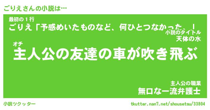 ごりえさんの小説は… オチ『主人公の友達の車が吹き飛ぶ』最初の1行『ごりえ「予感めいたものなど、何ひとつなかった。」』主人公の職業『無口な一流弁護士』 ツクッター #小説ツクッター http://tkutter.nan7.net/shousetsu/33804/