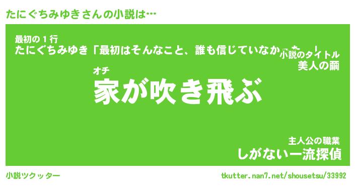 たにぐちみゆきさんの小説は… オチ『家が吹き飛ぶ』最初の1行『たにぐちみゆき「最初はそんなこと、誰も信じていなかった。」』主人公の職業『しがない一流探偵』 ツクッター #小説ツクッター http://tkutter.nan7.net/shousetsu/33992/
