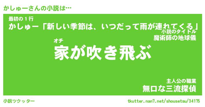 かしゅーさんの小説は… オチ『家が吹き飛ぶ』最初の1行『かしゅー「新しい季節は、いつだって雨が連れてくる」』主人公の職業『無口な三流探偵』 ツクッター #小説ツクッター http://tkutter.nan7.net/shousetsu/34175/