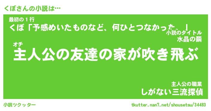 くぼさんの小説は… オチ『主人公の友達の家が吹き飛ぶ』最初の1行『くぼ「予感めいたものなど、何ひとつなかった。」』主人公の職業『しがない三流探偵』 ツクッター #小説ツクッター http://tkutter.nan7.net/shousetsu/34483/