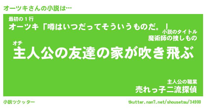 オーツキさんの小説は… オチ『主人公の友達の家が吹き飛ぶ』最初の1行『オーツキ「噂はいつだってそういうものだ。」』主人公の職業『売れっ子二流探偵』 ツクッター #小説ツクッター http://tkutter.nan7.net/shousetsu/34900/