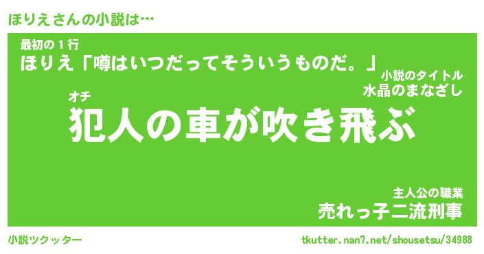 ほりえさんの小説は… オチ『犯人の車が吹き飛ぶ』最初の1行『ほりえ「噂はいつだってそういうものだ。」』主人公の職業『売れっ子二流刑事』 ツクッター #小説ツクッター http://tkutter.nan7.net/shousetsu/34988/