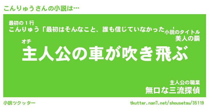 こんりゅうさんの小説は… オチ『主人公の車が吹き飛ぶ』最初の1行『こんりゅう「最初はそんなこと、誰も信じていなかった。」』主人公の職業『無口な三流探偵』 ツクッター #小説ツクッター http://tkutter.nan7.net/shousetsu/35119/