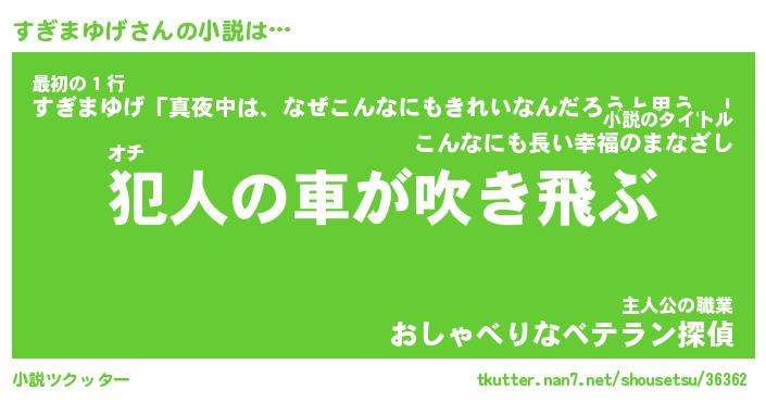 すぎまゆげさんの小説は… オチ『犯人の車が吹き飛ぶ』最初の1行『すぎまゆげ「真夜中は、なぜこんなにもきれいなんだろうと思う。」』主人公の職業『おしゃべりなベテラン探偵』 ツクッター #小説ツクッター http://tkutter.nan7.net/shousetsu/36362/