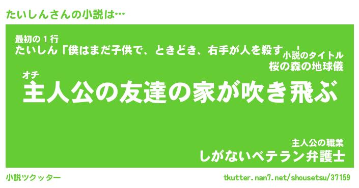たいしんさんの小説は… オチ『主人公の友達の家が吹き飛ぶ』最初の1行『たいしん「僕はまだ子供で、ときどき、右手が人を殺す。」』主人公の職業『しがないベテラン弁護士』 ツクッター #小説ツクッター http://tkutter.nan7.net/shousetsu/37159/