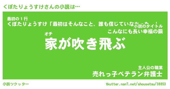くぼたりょうすけさんの小説は… オチ『家が吹き飛ぶ』最初の1行『くぼたりょうすけ「最初はそんなこと、誰も信じていなかった。」』主人公の職業『売れっ子ベテラン弁護士』 ツクッター #小説ツクッター http://tkutter.nan7.net/shousetsu/38853/