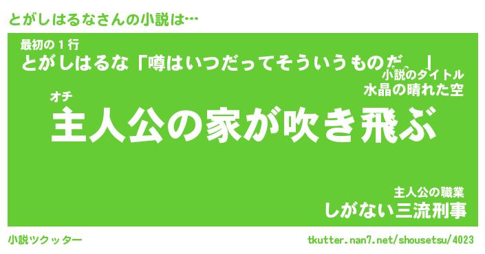 とがしはるなさんの小説は… オチ『主人公の家が吹き飛ぶ』最初の1行『とがしはるな「噂はいつだってそういうものだ。」』主人公の職業『しがない三流刑事』 ツクッター #小説ツクッター http://tkutter.nan7.net/shousetsu/4023/