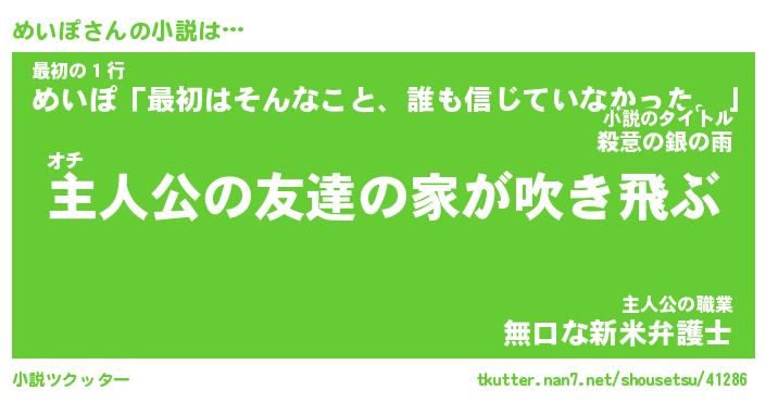 めいぽさんの小説は… オチ『主人公の友達の家が吹き飛ぶ』最初の1行『めいぽ「最初はそんなこと、誰も信じていなかった。」』主人公の職業『無口な新米弁護士』 ツクッター #小説ツクッター http://tkutter.nan7.net/shousetsu/41286/