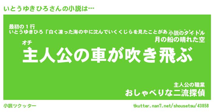 いとうゆきひろさんの小説は… オチ『主人公の車が吹き飛ぶ』最初の1行『いとうゆきひろ「白く凍った海の中に沈んでいくくじらを見たことがあるだろうか。」』主人公の職業『おしゃべりな二流探偵』 ツクッター #小説ツクッター http://tkutter.nan7.net/shousetsu/43858/