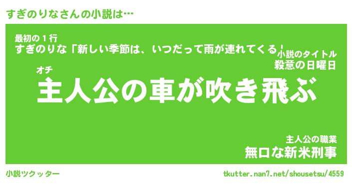 すぎのりなさんの小説は… オチ『主人公の車が吹き飛ぶ』最初の1行『すぎのりな「新しい季節は、いつだって雨が連れてくる」』主人公の職業『無口な新米刑事』 ツクッター #小説ツクッター http://tkutter.nan7.net/shousetsu/4559/