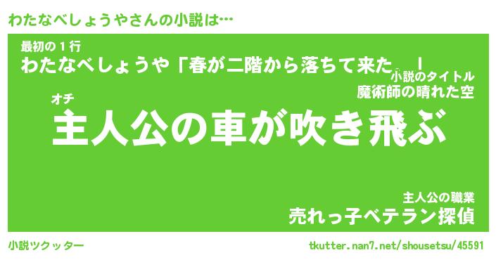 わたなべしょうやさんの小説は… オチ『主人公の車が吹き飛ぶ』最初の1行『わたなべしょうや「春が二階から落ちて来た。」』主人公の職業『売れっ子ベテラン探偵』 ツクッター #小説ツクッター http://tkutter.nan7.net/shousetsu/45591/