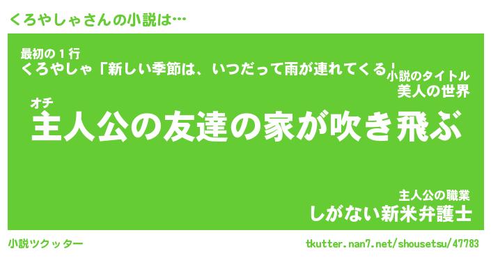 | 男性向けラノベタイトル風あだ名 | 『くろやしゃの憂鬱』 |