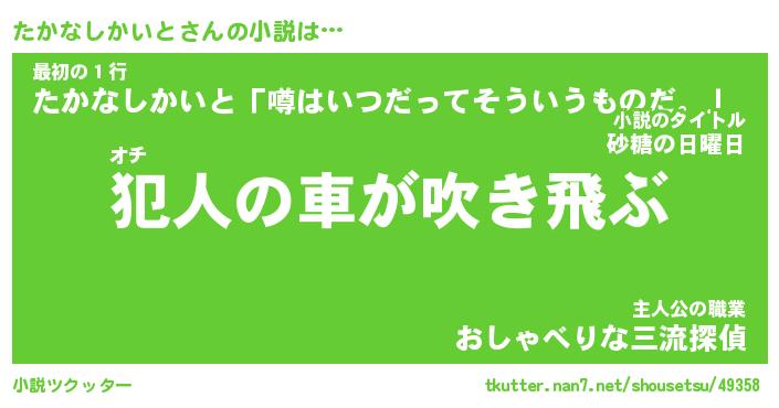 たかなしかいとさんの小説は… オチ『犯人の車が吹き飛ぶ』最初の1行『たかなしかいと「噂はいつだってそういうものだ。」』主人公の職業『おしゃべりな三流探偵』 ツクッター #小説ツクッター http://tkutter.nan7.net/shousetsu/49358/