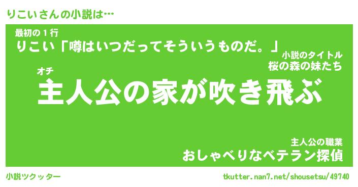 りこいさんの小説は… オチ『主人公の家が吹き飛ぶ』最初の1行『りこい「噂はいつだってそういうものだ。」』主人公の職業『おしゃべりなベテラン探偵』 ツクッター #小説ツクッター http://tkutter.nan7.net/shousetsu/49740/