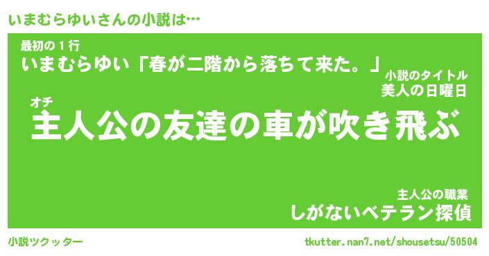 いまむらゆいさんの小説は… オチ『主人公の友達の車が吹き飛ぶ』最初の1行『いまむらゆい「春が二階から落ちて来た。」』主人公の職業『しがないベテラン探偵』 ツクッター #小説ツクッター http://tkutter.nan7.net/shousetsu/50504/