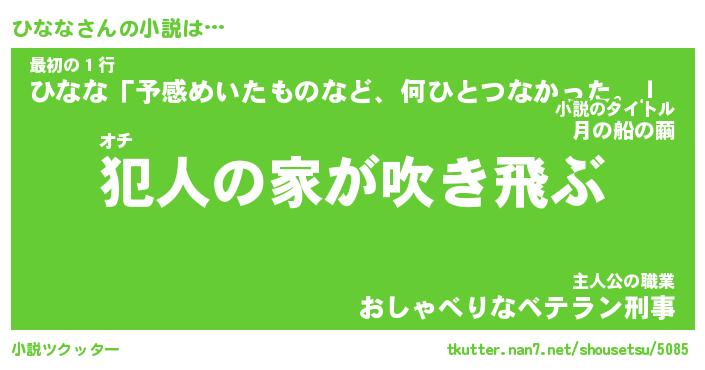 ひななさんの小説は… オチ『犯人の家が吹き飛ぶ』最初の1行『ひなな「予感めいたものなど、何ひとつなかった。」』主人公の職業『おしゃべりなベテラン刑事』 ツクッター #小説ツクッター http://tkutter.nan7.net/shousetsu/5085/