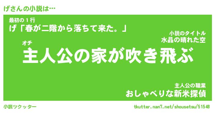 げさんの小説は… オチ『主人公の家が吹き飛ぶ』最初の1行『げ「春が二階から落ちて来た。」』主人公の職業『おしゃべりな新米探偵』 ツクッター #小説ツクッター http://tkutter.nan7.net/shousetsu/51548/