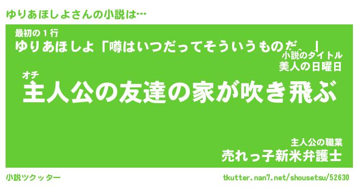 ゆりあほしよさんの小説は… オチ『主人公の友達の家が吹き飛ぶ』最初の1行『ゆりあほしよ「噂はいつだってそういうものだ。」』主人公の職業『売れっ子新米弁護士』 ツクッター #小説ツクッター http://tkutter.nan7.net/shousetsu/52630/