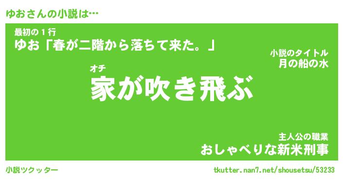 ゆおさんの小説は… オチ『家が吹き飛ぶ』最初の1行『ゆお「春が二階から落ちて来た。」』主人公の職業『おしゃべりな新米刑事』 ツクッター #小説ツクッター http://tkutter.nan7.net/shousetsu/53233/