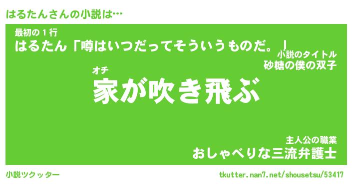 はるたんさんの小説は… オチ『家が吹き飛ぶ』最初の1行『はるたん「噂はいつだってそういうものだ。」』主人公の職業『おしゃべりな三流弁護士』 ツクッター #小説ツクッター http://tkutter.nan7.net/shousetsu/53417/