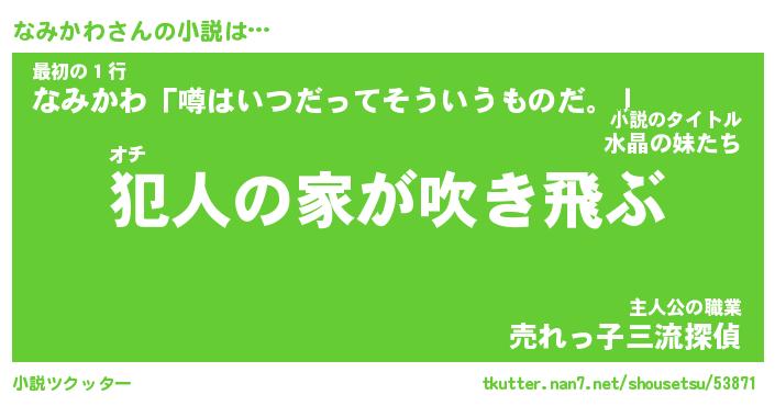 なみかわさんの小説は… オチ『犯人の家が吹き飛ぶ』最初の1行『なみかわ「噂はいつだってそういうものだ。」』主人公の職業『売れっ子三流探偵』 ツクッター #小説ツクッター http://tkutter.nan7.net/shousetsu/53871/