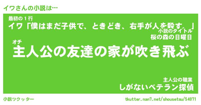 イワさんの小説は… オチ『主人公の友達の家が吹き飛ぶ』最初の1行『イワ「僕はまだ子供で、ときどき、右手が人を殺す。」』主人公の職業『しがないベテラン探偵』 ツクッター #小説ツクッター http://tkutter.nan7.net/shousetsu/54071/