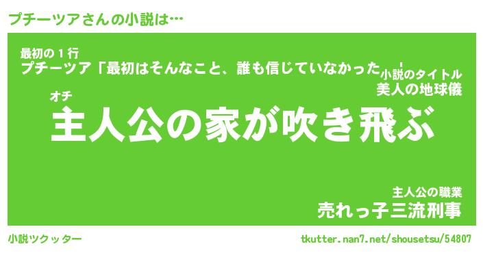 プチーツアさんの小説は… オチ『主人公の家が吹き飛ぶ』最初の1行『プチーツア「最初はそんなこと、誰も信じていなかった。」』主人公の職業『売れっ子三流刑事』 ツクッター #小説ツクッター http://tkutter.nan7.net/shousetsu/54807/