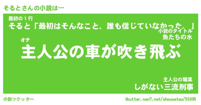 そるとさんの小説は… オチ『主人公の車が吹き飛ぶ』最初の1行『そると「最初はそんなこと、誰も信じていなかった。」』主人公の職業『しがない三流刑事』 ツクッター #小説ツクッター http://tkutter.nan7.net/shousetsu/55095/