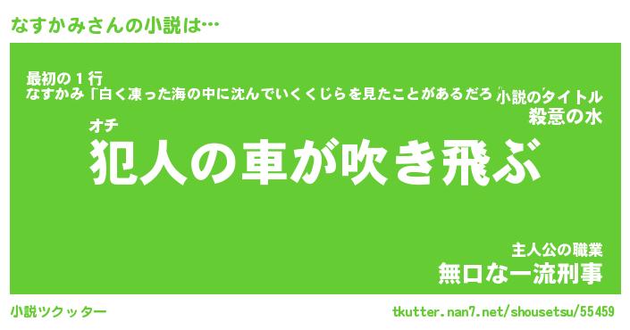 なすかみさんの小説は… オチ『犯人の車が吹き飛ぶ』最初の1行『なすかみ「白く凍った海の中に沈んでいくくじらを見たことがあるだろうか。」』主人公の職業『無口な一流刑事』 ツクッター #小説ツクッター http://tkutter.nan7.net/shousetsu/55459/