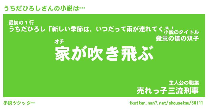 うちだひろしさんの小説は… オチ『家が吹き飛ぶ』最初の1行『うちだひろし「新しい季節は、いつだって雨が連れてくる」』主人公の職業『売れっ子三流刑事』 ツクッター #小説ツクッター http://tkutter.nan7.net/shousetsu/56111/