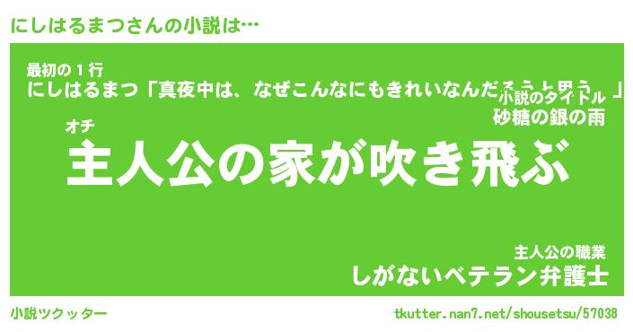 | 男性向けラノベタイトル風あだ名 | 『にしはるまつの憂鬱』 |