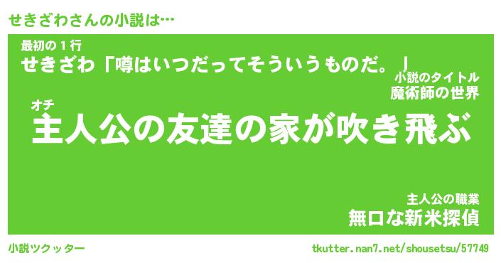 せきざわさんの小説は… オチ『主人公の友達の家が吹き飛ぶ』最初の1行『せきざわ「噂はいつだってそういうものだ。」』主人公の職業『無口な新米探偵』 ツクッター #小説ツクッター http://tkutter.nan7.net/shousetsu/57749/
