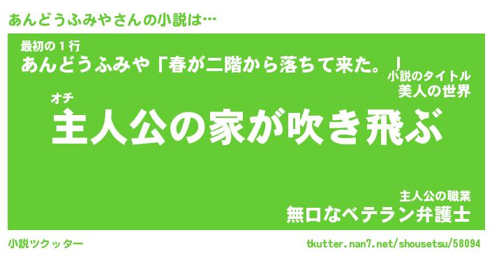 | 男性向けラノベタイトル風あだ名 | 『あんどうふみやの憂鬱』 |
