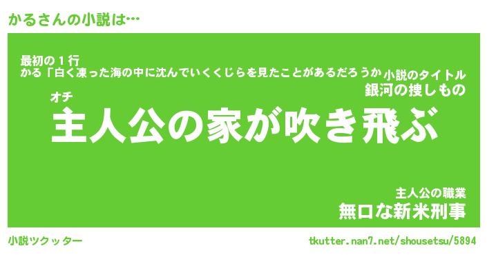 かるさんの小説は… オチ『主人公の家が吹き飛ぶ』最初の1行『かる「白く凍った海の中に沈んでいくくじらを見たことがあるだろうか。」』主人公の職業『無口な新米刑事』 ツクッター #小説ツクッター http://tkutter.nan7.net/shousetsu/5894/