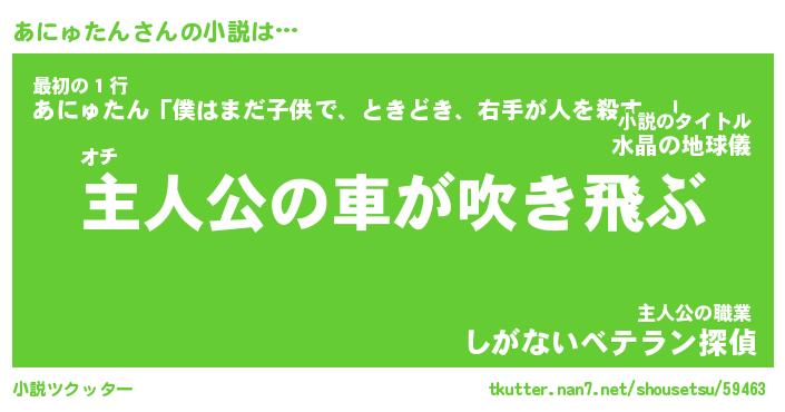 | 男性向けラノベタイトル風あだ名 | 『あにゅたんの憂鬱』 |