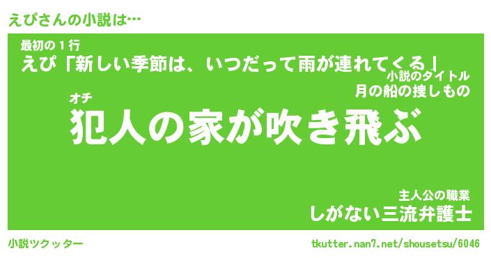 えぴさんの小説は… オチ『犯人の家が吹き飛ぶ』最初の1行『えぴ「新しい季節は、いつだって雨が連れてくる」』主人公の職業『しがない三流弁護士』 ツクッター #小説ツクッター http://tkutter.nan7.net/shousetsu/6046/